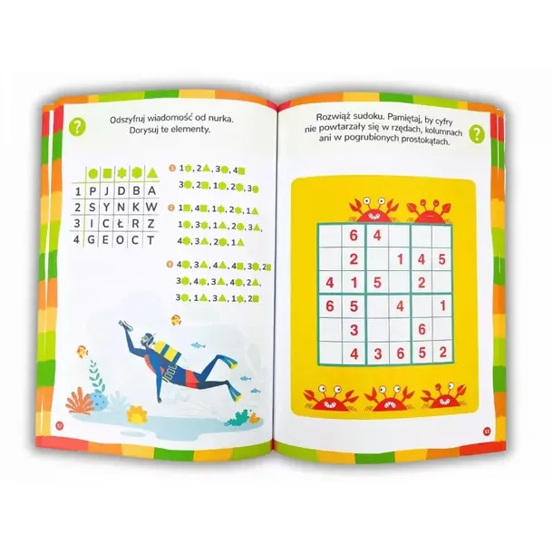 Porcja wciągających łamigłówek dla 6-latka! Łamigłówki dla 6-latka to książeczka pełna angażujących i rozwijających aktywności. Z tak licznymi i różnorodnymi zabawami dziecko nie zazna nudy w domu, podróży czy kolejce do lekarza, lecz także rozwinie spostrzegawczość, logiczne myślenie i wyobraźnię! Książeczka zapewnia długie godziny wciągającej zabawy – to blisko 100 kolorowych stron, a na nich między innymi: • wyzliczanki, • wyszukiwanki, • puzzle i rozsypanki obrazkowe, • labirynty, • szyfry i mapy, • kodowanie i sekwencje cyfr, • sudoku, • krzyżówki i rebusy. Na 6-latków czekają tutaj pełne fascynujących detali, piękne ilustracje, które zachęcają do samodzielnej zabawy i wciągają do świata łamigłówek i zgadywanek!