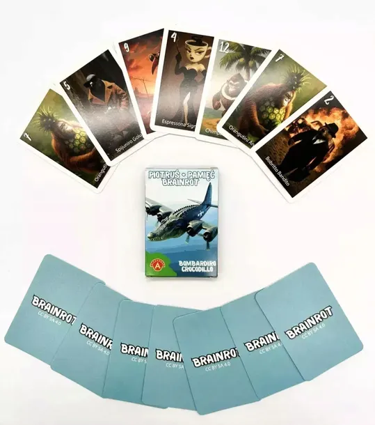 Uważaj na bombowego krokodyla! Witaj w świecie, gdzie AI puściła wodze wyobraźni, TikTok wybuchł memami, a dzieciaki wiedzą, że Lirilì Larilà to nie słonik, tylko pustynny generał w sandałach. „Piotruś: Brain Rot Bombardiro Crocodillo ” od Alexandra to klasyczna gra karciana, gdzie czekają na Ciebie totalnie oderwane od rzeczywistości postacie stworzone przez sztuczną inteligencję. W talii znajdziesz m.in.: • Bobrito Bandito – tajemniczy gangster, który mówi mało, ale działa dużo, • Espressona Signora – uosobienie gorzkiej elegancji i tajemniczości, • Lirilì Larilà – kaktusowy słoń w sandałach, mistrz pustynnych spacerów, • Spijuniro Golubiro – gołąb szpieg z misją niemożliwą, zawsze w garniturze, • Brr Brr Patapim – leśny wojownik z czapką pełną slimu i pierwszy obrońca Matczynej Puszczy, • Burbaloni Luliloli – kokosowa kapibara, która uwielbia pluskać się w morzu . Ale uwaga… W tej talii Piotrusiem jest Bombardiro Crocodillo – latający krokodyl, z którym nie ma żartów. Jeśli zostaniesz z nim na koniec – game over, amigo. Jak grać? • Rozdajcie karty, szukajcie par i zróbcie wszystko by nie zostać z Bombardirem. „Piotruś: Brainrot” – nie tylko gra, ale też wstęp do szalonego uniwersum, w którym nawet wyobraźnia nie stawia granic. Gotowi na partyjkę pełną śmiechu, niedorzecznej fantazji i… krokodylich pułapek?