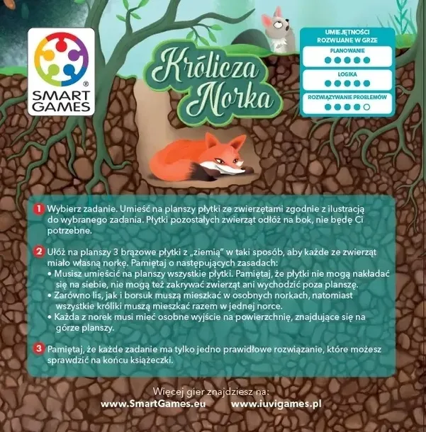 Pomóż zwierzątkom znaleźć dom W „Króliczej Norce” – magnetycznej grze logicznej, zwierzaki potrzebują pomocy Twojego dziecka. Każde zwierzątko chce mieć swoje miejsce w norce. Mały gracz, wykorzystując logiczne myślenie i planowanie, będzie miał możliwość rozwiązania 48 zadań o narastającym poziomie trudności. Każde z nich sprawi, że pociecha, miło spędzając czas przy angażującej rozgrywce, w naturalny sposób nabędzie ważne dla dalszego rozwoju umiejętności. Zachęć dziecko do zabawy lub baw się razem z nim! Zawartość opakowania: • magnetyczna książeczka-plansza z 48 zadaniami i ich rozwiązaniami, • 3 magnetyczne płytki ziemi, • 6 magnetycznych płytek ze zwierzątkami (1 lis, 1 borsuk, 4 króliki). Za co pokochasz tę grę? • Gra, która sprawdzi się każdemu niezależnie od wieku. • Mały format gry, dzięki czemu można grać w nią wszędzie – nawet w podróży! • Zróżnicowany poziom trudności sprawi, że ta gra szybko się nie znudzi!